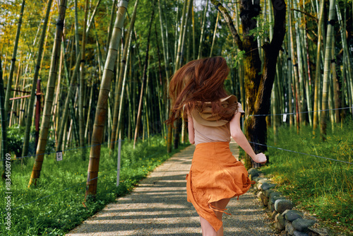 Obraz premium Woman running along a winding bamboo forest path in summer, orange skirt flowing, back view showing motion and carefree movement among tall green stalks on a shaded trail.