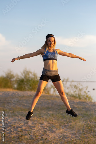 Fototapeta premium Woman Running and Jumping Outdoors at Sunset