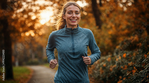 © OSORIOartist, Obraz premium Woman running in autumn forest for mental health. Generative AI