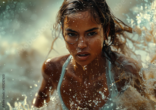 © Анна Терелюк, Obraz premium Woman running through the water with her hair and body covered in water