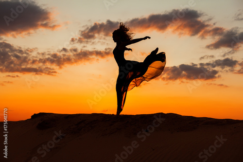 © Petro, Naklejka premium Woman runs along the barkhans against the backdrop of the setting sun.