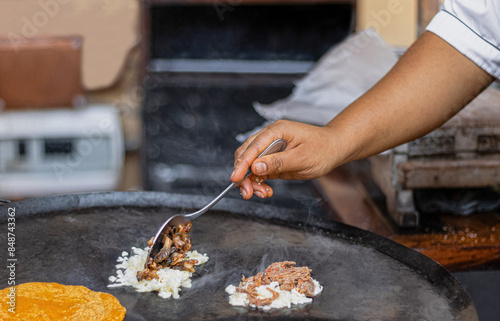 Obraz premium woman's hand cooking mexican food, heating tortillas and preparing carnitas y...