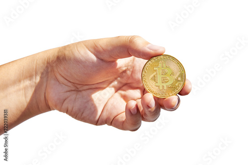 © T.Dz, Fototapeta premium Woman’s hand holding golden Bitcoin on white background. Isolated on white. Business concept.