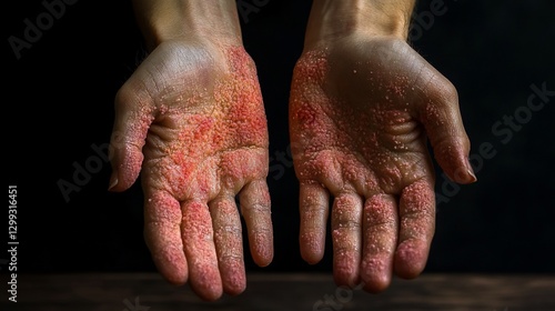Fototapeta premium Woman's hands, covered in red glitter, outstretched against dark background