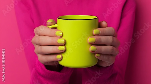 © Putri, Obraz premium Woman's hands holding a bright yellow mug against a pink background
