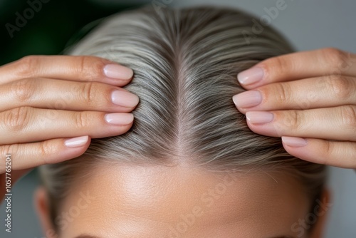 © fotogurme, Fototapeta premium Woman's hands parting thinning hair, close-up, neutral color palette