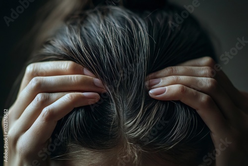 Fototapeta premium Woman's hands parting thinning hair, close-up, neutral color palette