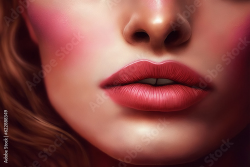 © alexkoral, Obraz premium woman's lips with pink lipstick and an open mouth on a female face close-up. Beauty concept. Generative AI illustration
