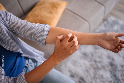 © Jelena, Fototapeta premium Woman scratching her itchy arm, suffering from dermatitis at home