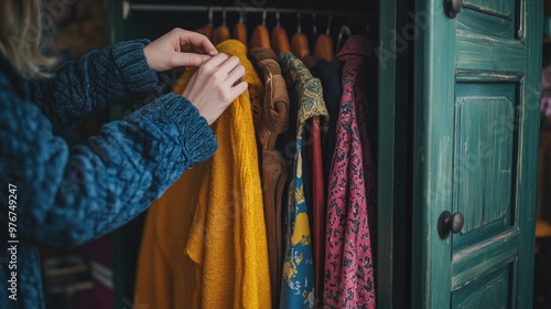 Fototapeta premium Woman selecting clothes from a vintage wardrobe. This photo can be used for blogs, articles, or social media posts related to fashion, style, or vintage clothing.