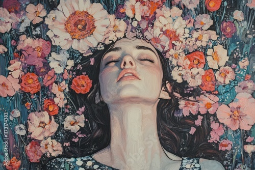 © arri, Fototapeta premium Woman Serenely Surrounded By Vibrant Blossoms