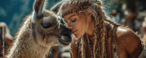 © Art_You, Obraz premium Woman sharing a gentle moment with a llama in a scenic setting
