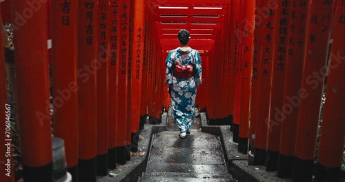 Fototapeta premium Woman, shinto religion and walk by gates in japan, spiritual path and indigenous culture in kimono. Person, traditional clothes or worship in peace, respect or beauty by Fushimi Inari Taisha in kyoto