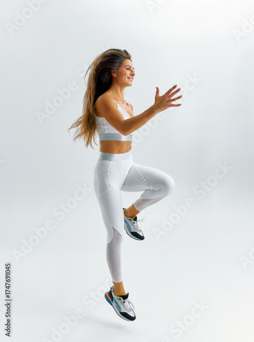 © makedonski2015, Fototapeta premium Woman showcases her athleticism by performing a dynamic workout routine