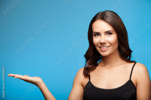 Fototapeta premium woman showing copyspace or something, on blue
