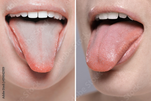 Obraz premium Woman showing her tongue before and after cleaning procedure, closeup. Tongue coated with plaque on one side and healthy on other, collage