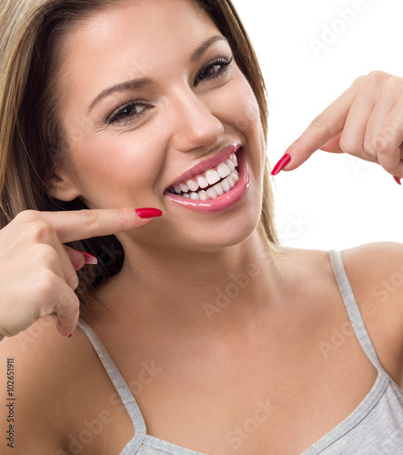 Naklejka premium Woman showing her white teeth