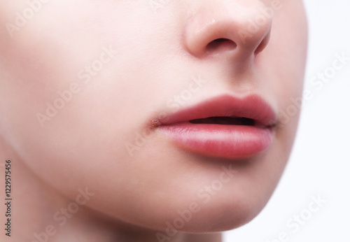 © Dimid, Obraz premium Woman showing herpes disease on her lips. Treatment of viral infections.