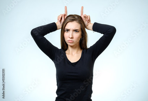 © Iurii, Fototapeta premium Woman showing horns with her fingers