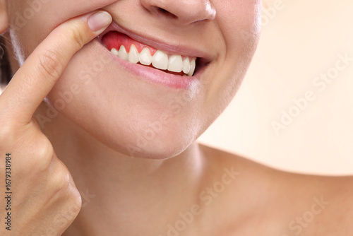 Fototapeta premium Woman showing inflamed gum on beige background, closeup