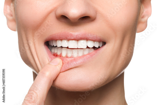 Obraz premium Woman showing inflamed gum on white background, closeup