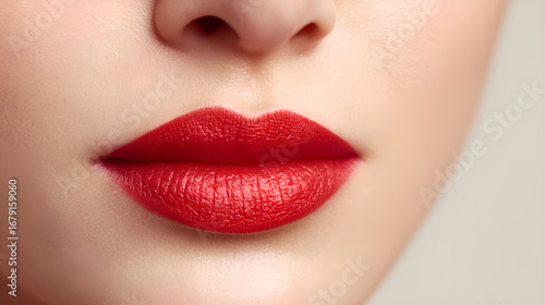 © utaem2022, Fototapeta premium Woman showing red lipstick on her perfect lips closeup