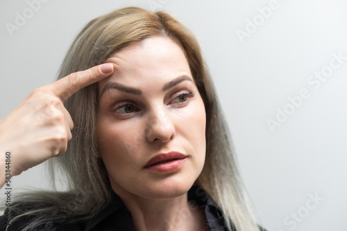 Fototapeta premium woman shows drooping eyelid for plastic surgery
