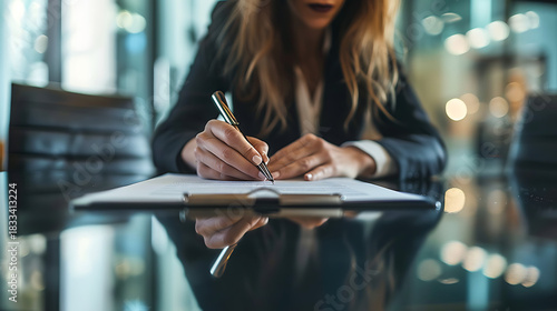 Obraz premium woman signing a legal contract on a smooth black conference table, elegant...