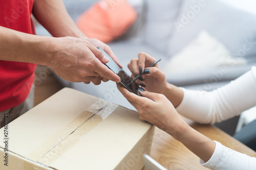 © Pormezz, Obraz premium Woman signing on mobile to get package from delivery man.