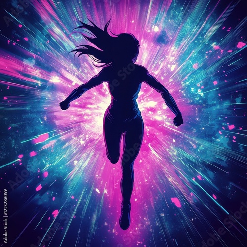 © novian, Fototapeta premium Woman Silhouette Running Through Neon Light Burst