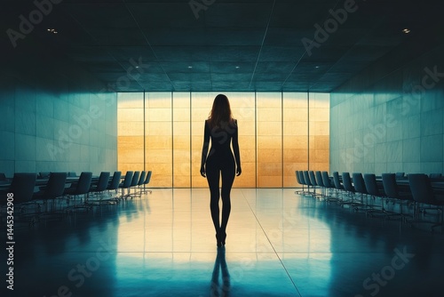 © zain, Obraz premium Woman silhouetted walking towards sunset in a modern glass building cool tones reflective floor