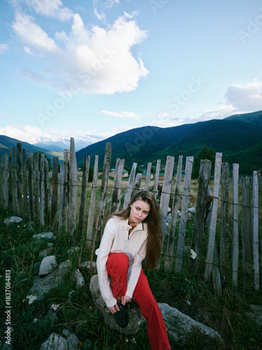 © SHOTPRIME STUDIO, Obraz premium Woman sits by a weathered wooden fence in a mountainous landscape, wearing a light sweater and red pants, exploring nature and countryside ambience under a blue sky with scattered clouds.