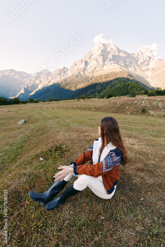 © SHOTPRIME STUDIO, Fototapeta premium Woman sits on meadow facing distant mountains in a wide landscape of nature. Autumn jacket and rubber boots, solitary traveler enjoying calm outdoor scenery and mountain view.
