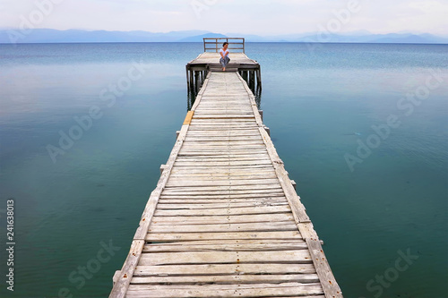© jekatarinka, Obraz premium woman sits on the pier, Corfu Greece