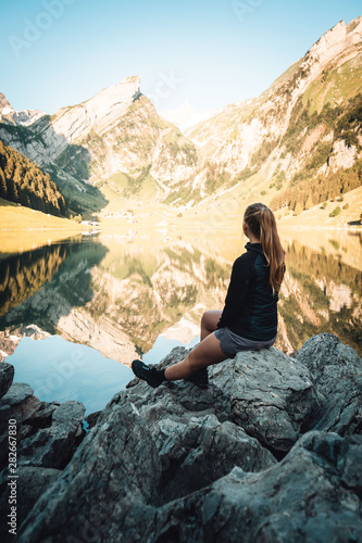 © Niklas Spiegler, Naklejka premium woman sitting at mountain lake