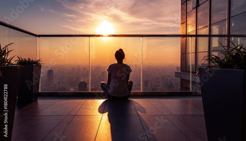 © Wee Ha, Obraz premium Woman sitting cross-legged on a rooftop terrace overlooking a sunset cityscape.