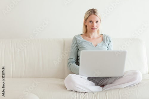 Fototapeta premium Woman sitting cross legged on the sofa with her notebook