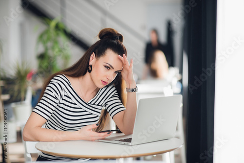 Fototapeta premium Woman sitting in a cafe in front of a laptop thinking about a problem with...