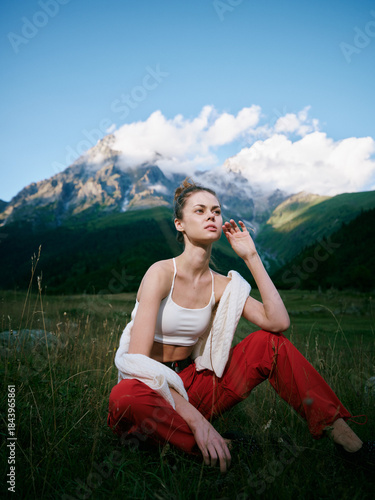 © SHOTPRIME STUDIO, Fototapeta premium Woman sitting on a grassy field with a towel draped over her shoulder, casual white top and red pants, framed by a mountain landscape under a bright blue sky.