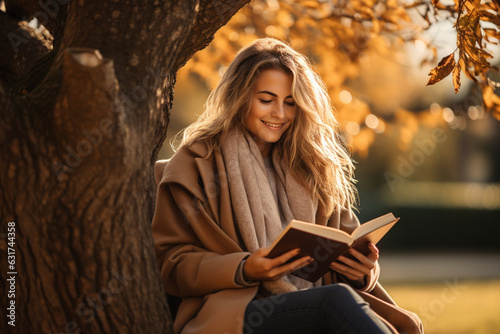 © forenna, Obraz premium woman sitting outdoors under a tree with a book and a hot drink, savoring the peacefulness of autumn Generative AI