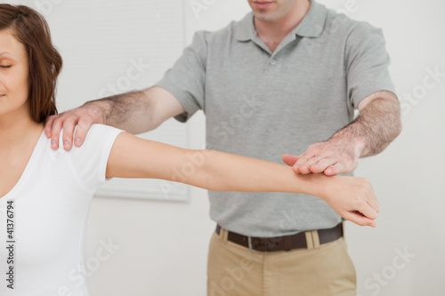 © WavebreakmediaMicro, Obraz premium Woman sitting while a doctor is examining her arm