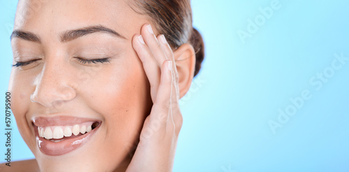 © Anela R/peopleimages.com, Fototapeta premium Woman, skincare and hands on face in studio for makeup, wellness or gentle cleaning on blue background. Face, beauty and girl skin model relax in luxury, facial and cosmetic treatment while isolated