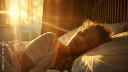 Obraz premium Woman sleeping peacefully in morning sunlight in cozy bedroom, peaceful rest...