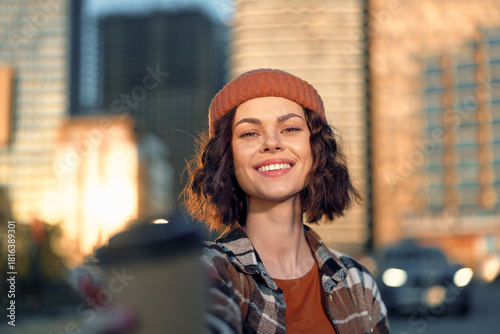Fototapeta premium Woman smile coffee urban portrait, candid lifestyle capture at golden hour glow with authenticity and mindful living, emotional storytelling in a warm modern city scene.