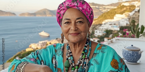 Obraz premium Woman smiles, wearing a pink turban and turquoise dress. She is on a balcony with a sea view