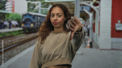 © Krakenimages.com, Fototapeta premium Woman smiling and giving thumbs up and thumbs down while standing on train station platform beside a freight railcar; approval optimism.