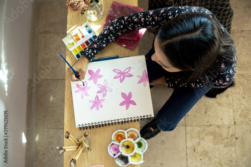© Francisco Díaz, Fototapeta premium woman smiling and learning activity at home, during quarantine, overhead shot, painting with watercolor