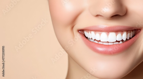 © oksa_studio, Fototapeta premium Woman smiling brightly, showing her perfect white teeth and healthy gums, representing dental care and oral hygiene