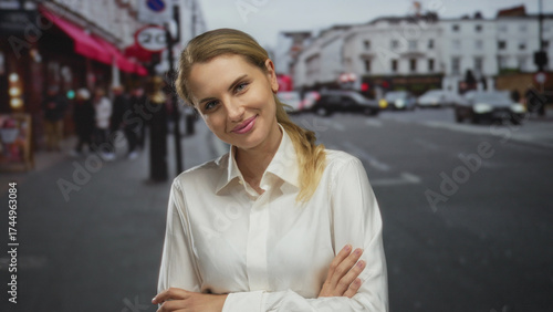 © Krakenimages.com, Fototapeta premium Woman smiling confidently in a city street with arms crossed wearing a white shirt outdoors in an urban european setting with traffic and pedestrians in the background.