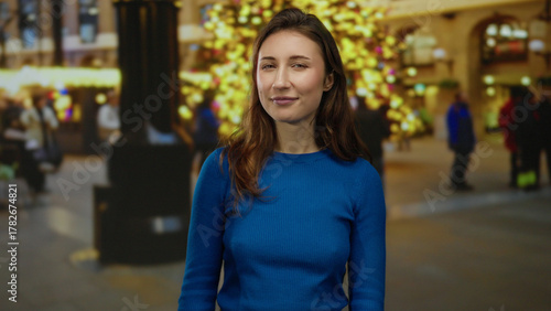 © Krakenimages.com, Fototapeta premium Woman smiling on city street during holiday night with bright lights and festive ambiance, young woman in blue sweater enjoying vibrant urban atmosphere outdoors.